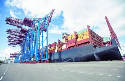 5月28日,一艘集装箱货轮停靠在德国汉堡港CTT集装箱码头。 新华社记者 张帆摄